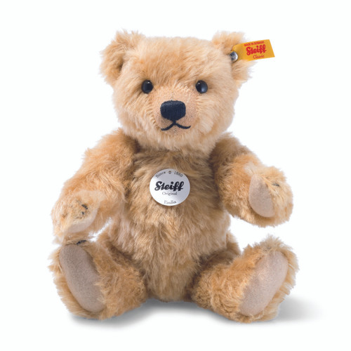 Just like the world’s first Teddy bear (made by Steiff, naturally), Emilia Teddy Bear is made of genuine reddish-blonde colored mohair and is five-way jointed. She measures 10 inches tall, she has hand-stitched features and wears wool felt paw pads. Emilia proudly wears the famous "Button in Ear" trademark, symbol of highest quality. He comes to you from the company that started it all — the inventors of the Teddy bear. Product Details: Collection: High-end Gifts Material: Made of finest mohair stuffed with synthetic filling material (57% mohair, 43% cotton) Size: 10 inches Color: Reddish blonde Eyes: With safety eyes Ear Tag: With stainless steel "Button in Ear" Joints: 5-way jointed Sound Device: None Care: Surface washable Country of Origin: Made in Germany CAUTION: This product is not a toy and is intended for adult collectors only