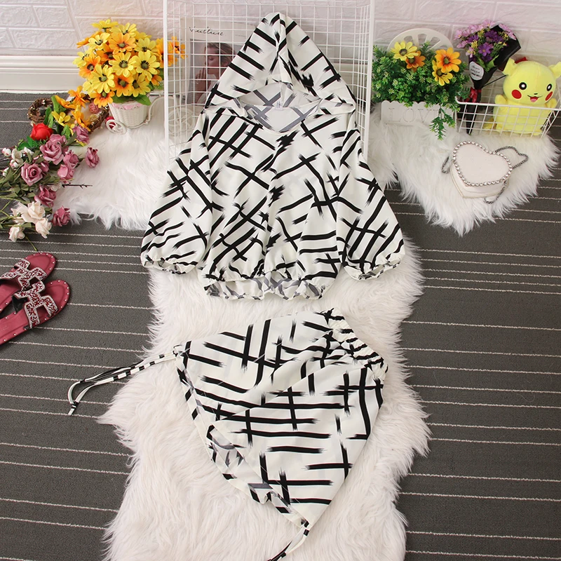 Fashion Casual Sports Suit Women Summer Thin Loose Hoodie Printed Top + High Waist Drawstring Wide Leg Shorts Two Pieces Suits