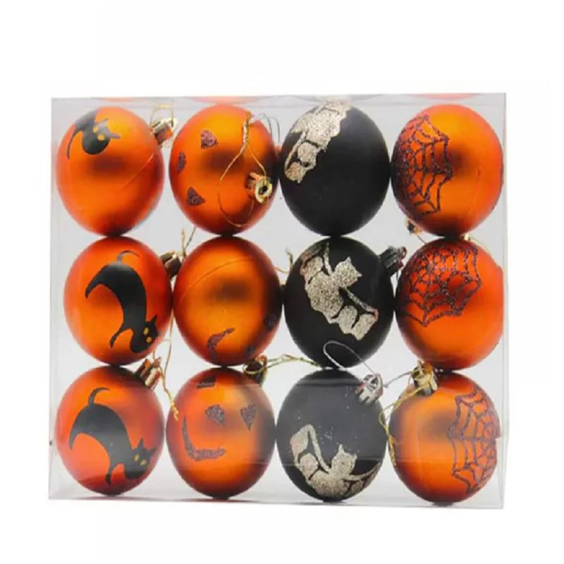 12Pcs Halloween Hanging Balls Pumpkin Bat Spider Web Tombstone Shatterproof Ball for Wreath Ornaments Party Decoration Description: Material:Plastic Size:6CM Color:Orange and Black Feature: Durable and Reliable Hanging easily Wide functions Unique design Great items Package included: 12Pcs x Halloween Hanging Balls