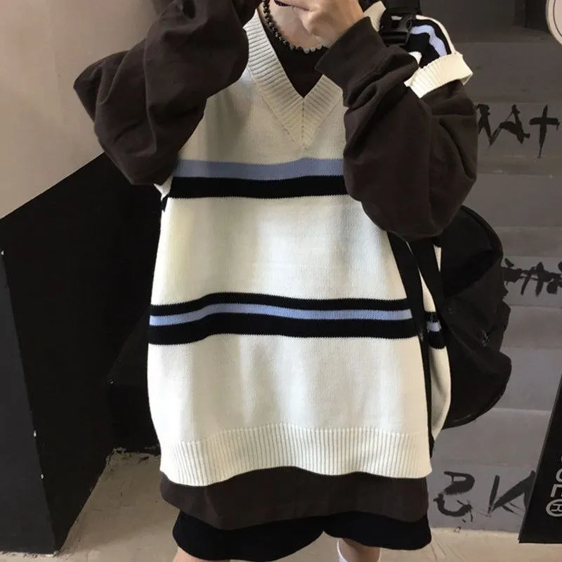 Harajuku Knitted Vest Men Women Japanese Vintage Sleeveless Sweater Streetwear Unisex Fashion Casual Loose Pullover Tops Clothes