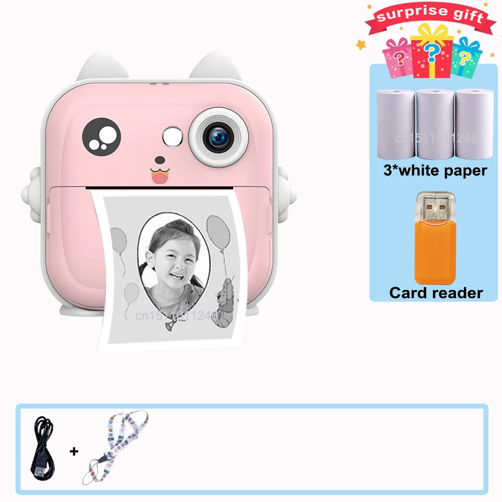 Kids Instant Camera 2 IPS Screen Full HD Instant Print Digital Camera Light Ear With Lanyard Birthday Gifts for Boys Gilrs Specifications: Display Screen: 2 Inch IPS Screen FOG:TFT-LCD Image Resolution: 24MP Video Resolution: FHD(1920*1080px)/HD(1280*720px) Battery Power:7/800MAH*2 Printing resolution: 203dpi (point density: 8 elements per millimeter) Printing method: thermal Effective printing width: 48mm Printing paper width: 58mm Printing speed: 40-80mm/s APP Name: Funprint APP languages: Portuguese, English, French, Italian, Spanish, German, Greek, Russian, Polish, Japanese, Korean, Thai Packing List: Instant Print Camera * 1 USB Data Cable*1 Neck Lanyard * 1 Thermal Paper *3 rolls Manual * 1 Detailed Photos: