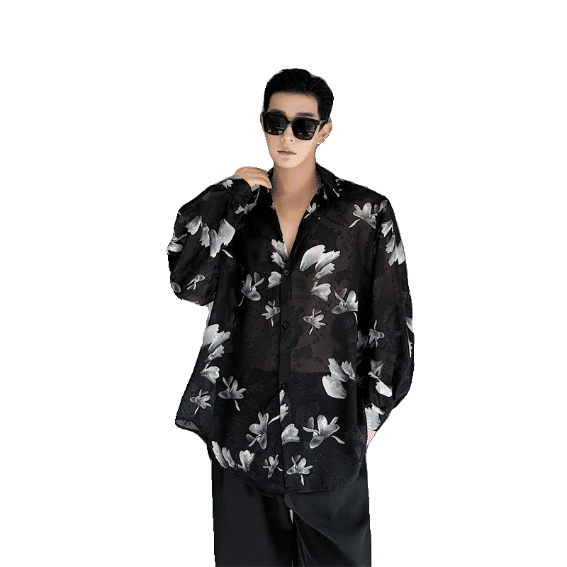 Men See Through Lightweight Loose Casual Vintage Print Long Sleeve Party Dress Shirts Beach Blouses Man Performance Costumes