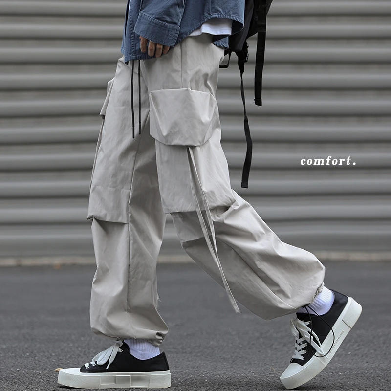Men's Loose Straight Multi-pockets Ribbons Cargo Pants Black Gray