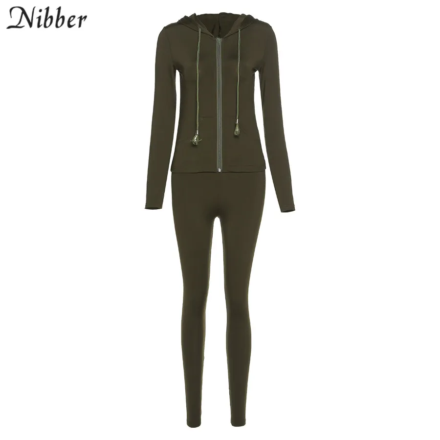 Nibber Sporty Casual Long Sleeve Hooded Zipper Solid two pieces set women Autumn Workout Skinny Top And Pants Matching Set mujer