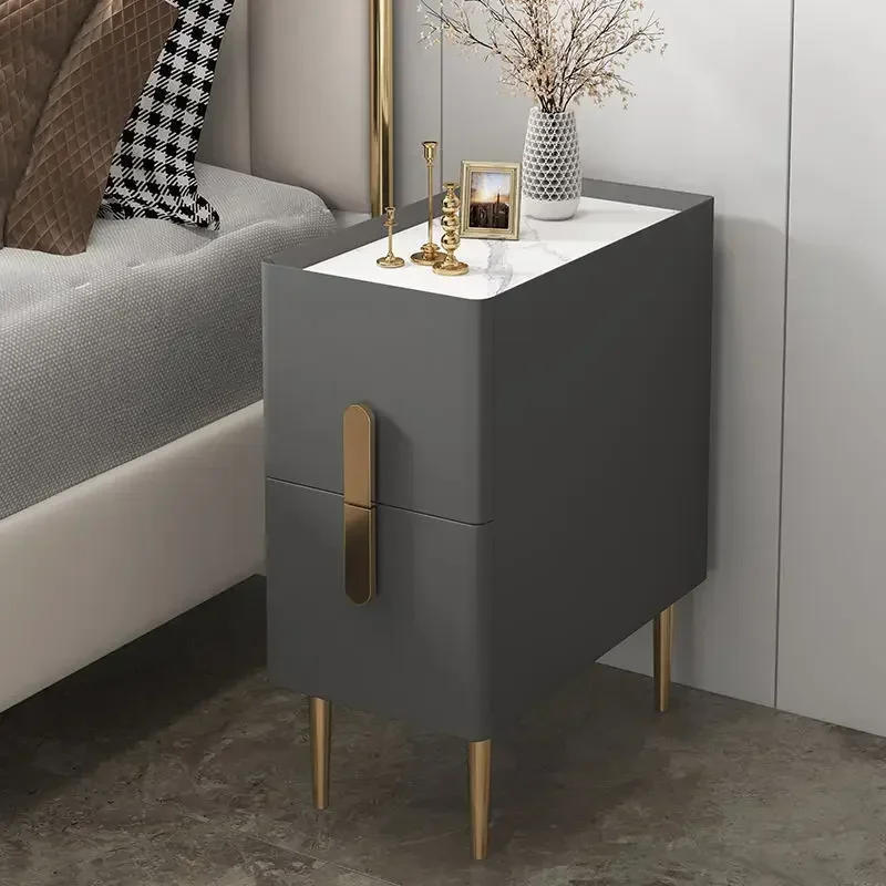Nordic Style Bedside Table Modern Mini Narrow Rock Surface Nightstand Self-Contained 2 Drawers Wooden Bedroom Tables