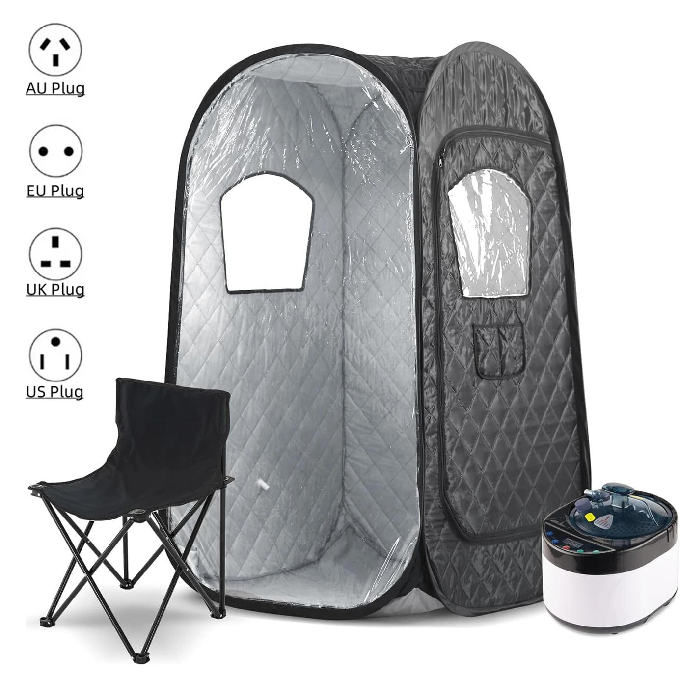【New Design】The new sauna subject design supports a real full body sauna, similar to a traditional wooden sauna but more handy and easy to use, shouldn't have to install. NOTE: There Includes sauna tent(with a connecter to attach the steamer pot) and deliver bag only, the color of deliver bag is random【Comfortable Size】The Expanded size of tent is: 31”(length)* 31”(width)* 55”(high). The equipment length is: 15”(length)*15”(width)*3”(high)【Portable Convenient】It could be carried lightly and make it extra helpful right through use. It can be folded and kept when no longer in use, saving area folded length is adequately small to fit wherever it can be stored, similar to wardrobes, trunks, etc【Easy Access】The double-headed zipper will present you with entry with out difficulty, and the double pockets unfastened you to loose your hands【User-friendly】The transparent window will provide you with an open view and can be opened directly to breathe brand new air once you really feel uncomfortable Heating Type:Electric PowerPower:1600WVoltage:110V-240V Package Included:1 x 4L Sauna Steamer1 x Set Sauna Tent1x Chair1 x Intelligent handheld remote control