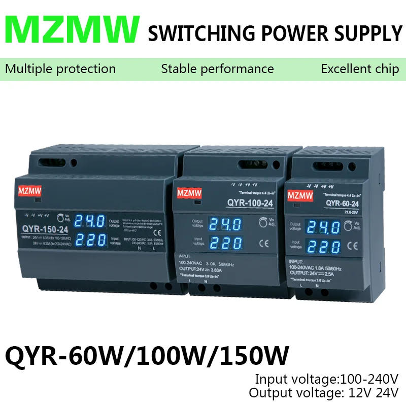 QYR-60W 100W 150W DIN Rail Switching Power Supply AC-DC 12V 24V with Digital Display Step Shape Industrial for LED Light Strip