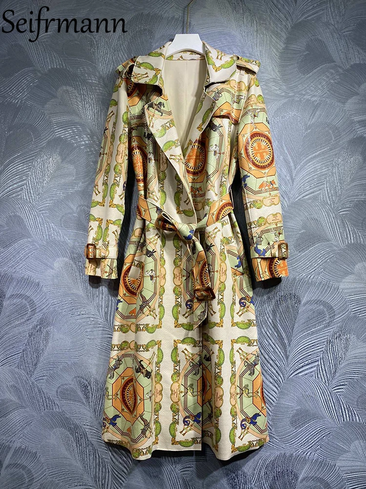 Seifrmann 2023 Winter Women Fashion Runway Trench Coats Long Sleeve Belt Vintage Printed Loose Elegant Ladies Coats Overcoat