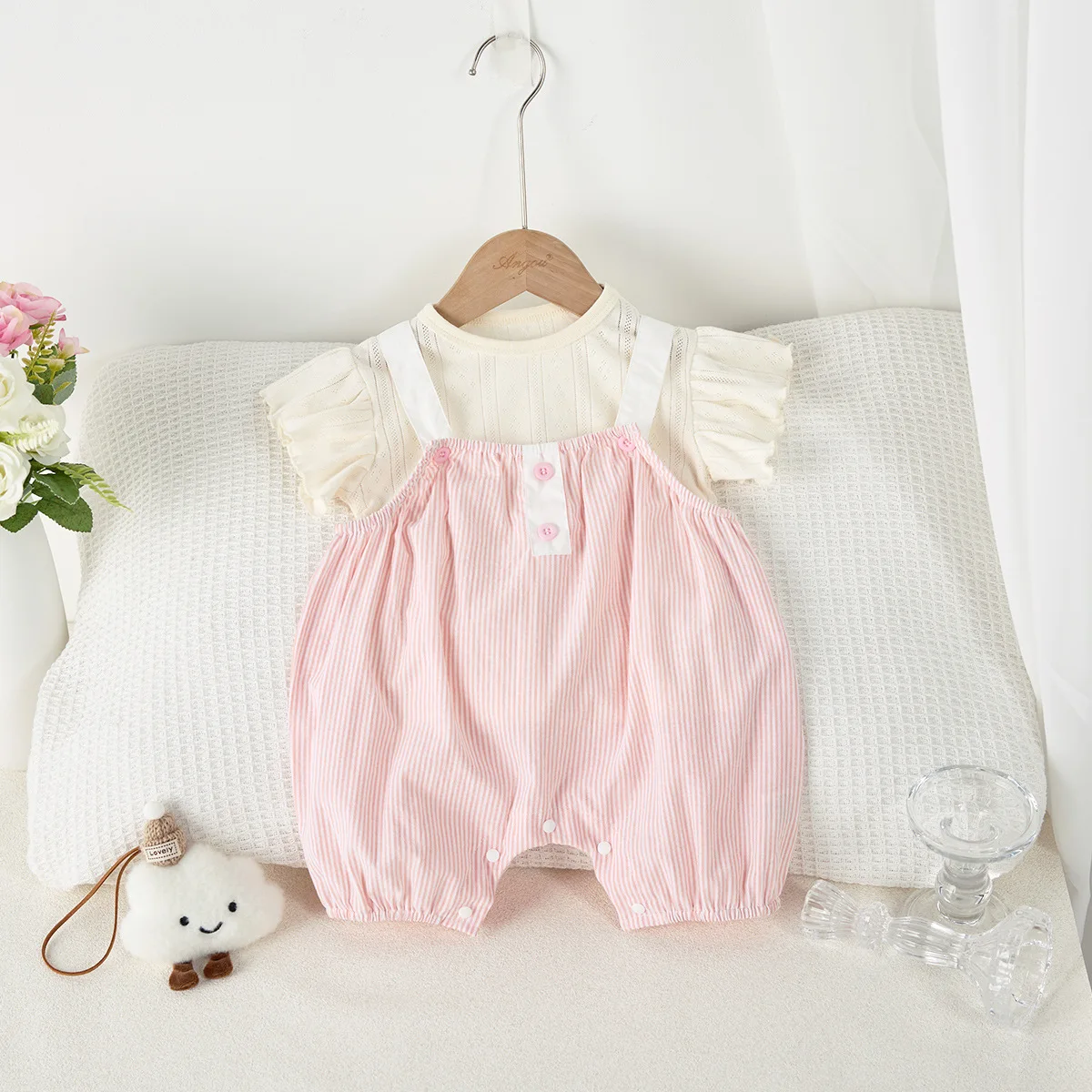 Summer Infant and Toddler Set, Female Baby Thin Vertical Striped Strap Pants Minimally Stylish Cotton Top, T-shirt Two Piece Set