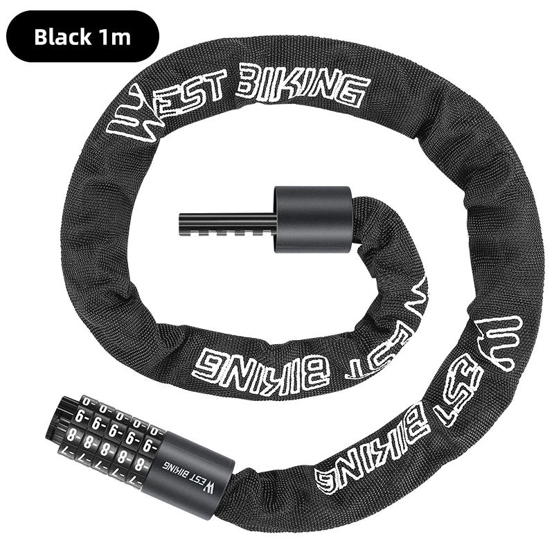 5 digit mixture chain lock Brand : WEST BIKING Material : ABS plastic、 zinc alloy lock core、 A3-iron Length : 1m/1/1 Weight : 1m: 643g; 1: 757g; 1: 926g Application : bike, electric bicycle, motorcycle, door, and so forth Features : 5 digit password, thicken chain, mushy password wheel
