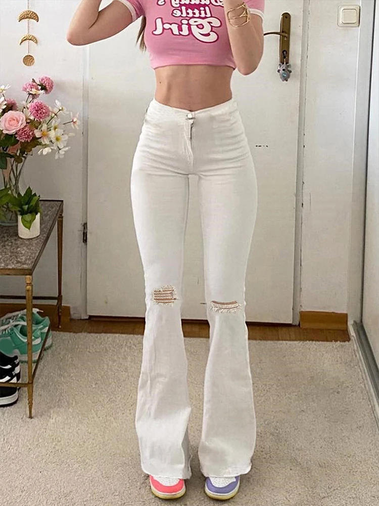 Women Flared Jeans Pants Girl High Waist Hole Trumpet Denim Trousers Slim Y2k Clothing Casual Wide Leg Long Pants Streetwear New