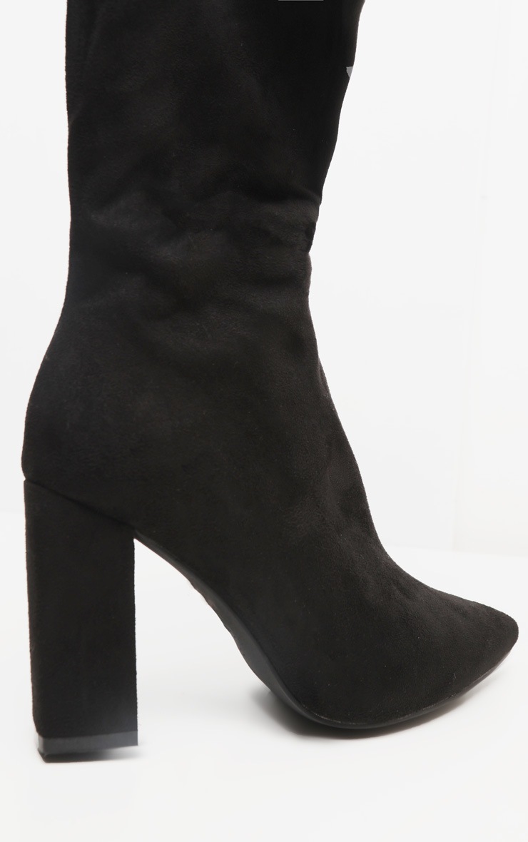 PUt your best foot forward this season with these must-have boots. Featuring a black faux suede material, a block heel and a thigh-high length, team these with a mini dress for a totally head-turning look. Faux suede Zip fastening 4" heel Category: Footwear Product type: Wide Fit Boots Colour: Black Material: Faux Suede Design: Plain Occasion: Evening Product Code: CMF1834