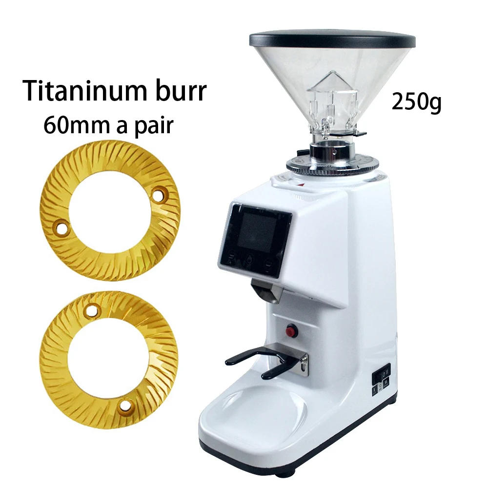 Features of espresso grinder *Heavy responsibility forged Aluminum physique *Powered through quiet low speed, high torque motor *Stainless metal powder outlet port *3 inch touch display LCD show *Standards colors: white and black * Can set single or double espresso grinding Grinding stones :60mm/Titaninum burr Hopper capacity:750g/250g Speed:2000Rpm Gross weight:5 Voltage:220V 50Hz/110V 60Hz Dimension of machine:22*14*47cm Power:200W Drive way:Touch panel Body material:Cast aluminum alloy Available colors:Black/White