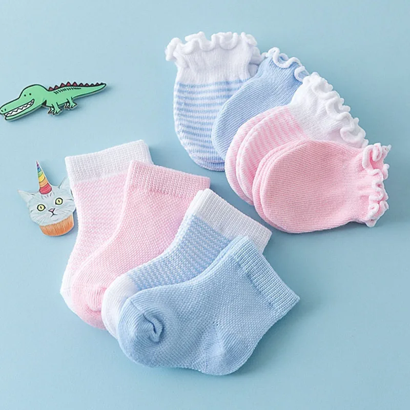 Cotton Baby Socks 4 Pairs Newborn Gloves Socks Set Spring Anti Scratch Bite Gloves Photography Props Infant Boys Girls Accessori