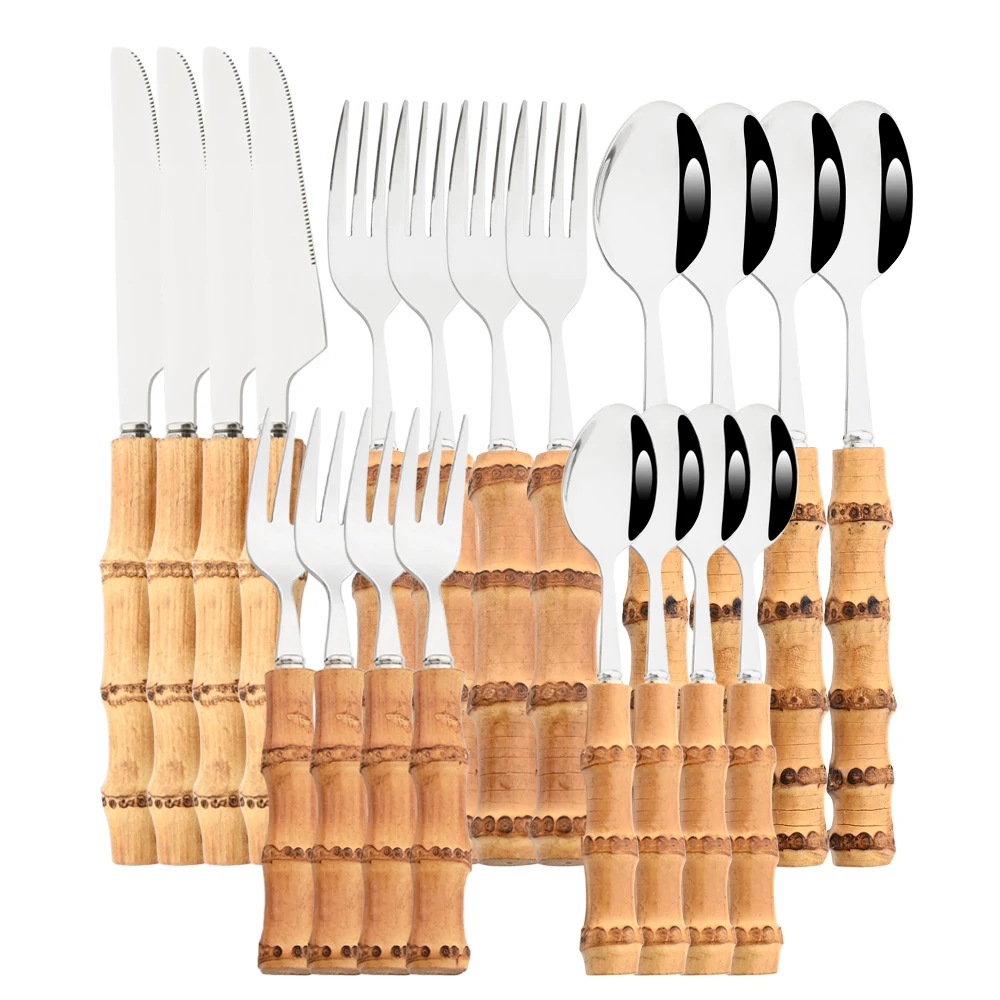 Drmfiy 4/20Pcs Natural Bamboo Handle Silver Dinnerware Set Stainless Steel Cutlery Set Kitchen Knife Fork Spoons Tableware Set