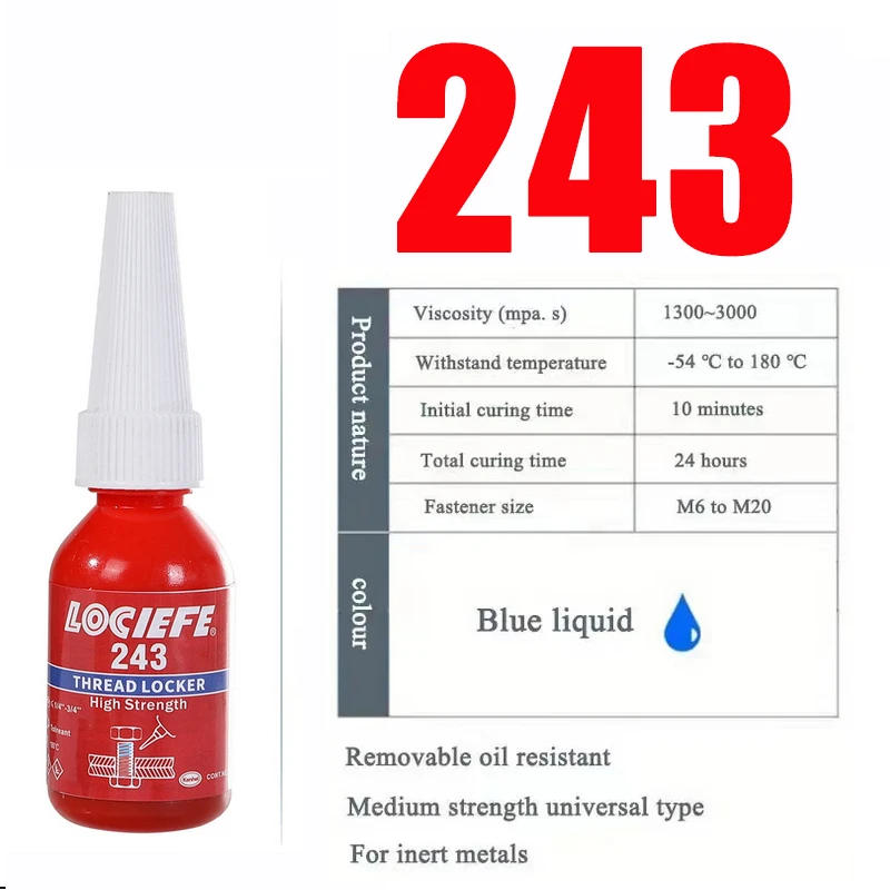 10ml Threadlocker High Strength Anaerobic adhesive 242 243 263 271 272 Blue Screw Thread Locker Agent Anaerobic adhesive GlueUsage:Apply flippantly to the screw and tighten the nut, look ahead to 24 hours for whole curing.Description:Product Name: Screw GlueProduct Specifications: 10mlProduct Features: Medium Strength, Oil Resistance, Easy To Disassemble Storage Conditions: Store In A Cool Place At 15-28℃Features:1. Fill The Leak, Apply Glue To The Gap In The Gap, And Fill It2. Lock Tightly To Prevent Loosening, The Bottle Mouth Is Very Tight To Prevent Leakage3. Fixed Teeth Positioning, Can Keep Objects Stuck In Place Without Falling Off4. Sealed And Leak-proof, The Bottle Mouth Is Sealed And Does Not Leak5. Wide Range Of Occasions, Rusty Screws, Inadequate Sealing, Etc.Package Included:1pc*(1 Screw Glue)*Points for attention:1. This product isn't always appropriate for use in natural oxygen or oxygen rich environments, and cannot be used as a sealing materials for chlorine gas or other strong oxidizing substances.2. This product is not suitable to be used on plastics, particularly thermoplastic materials which will cause stress cracking.3. Apply an acceptable quantity of glue, as floor overflow can impact inside curing. If there may be any overflow, it is strongly recommended to reapply the glue.4. This product works better with a thin adhesive layer below 0.05mm. For oversized threads, a larger gap can affect the curing velocity and power of the product.