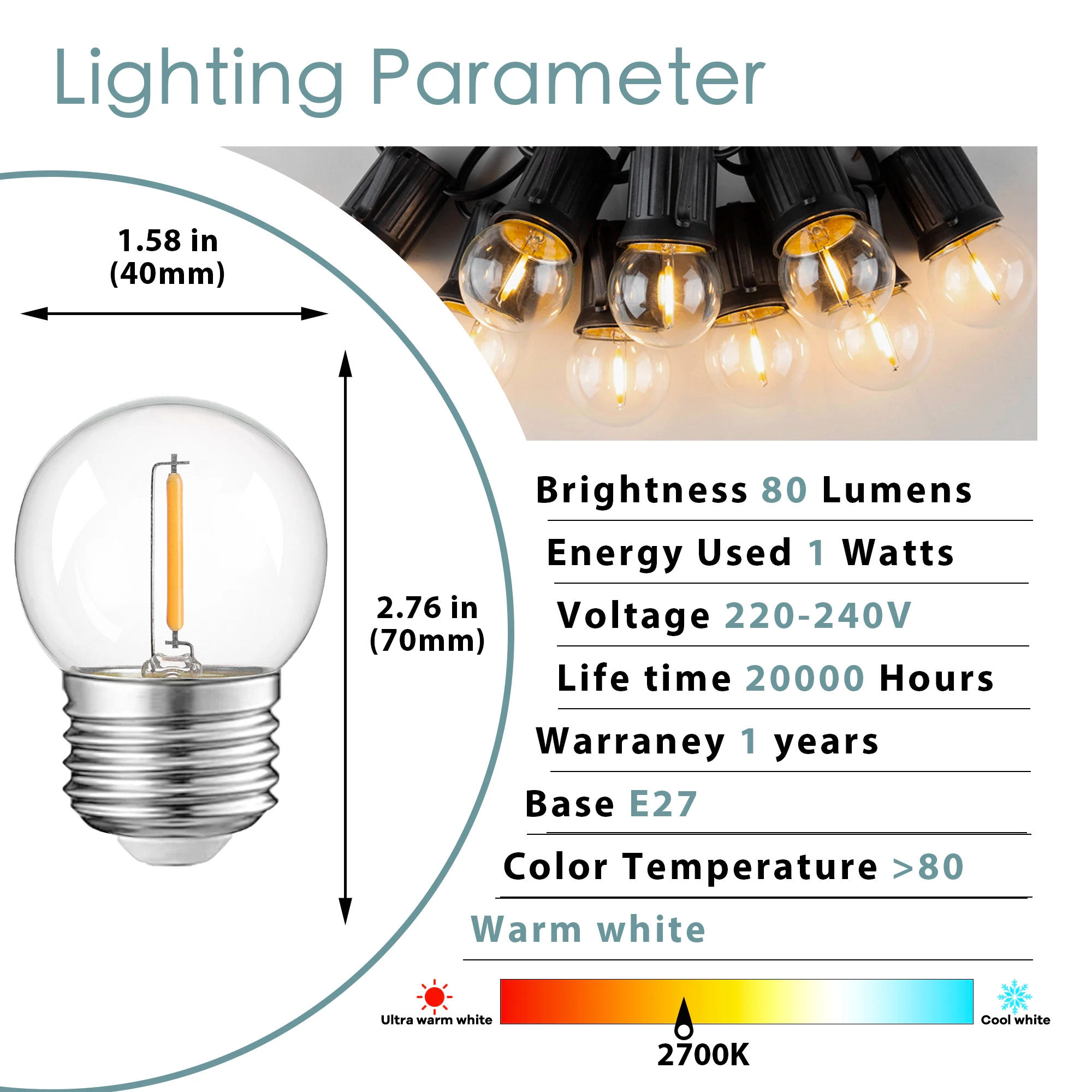 Specofication: Name:G40 Led Filament Low Wattage Light BulbLamp Base: E27Emitting Colors:White White 2700KVoltage:AC220VWattage:1W Dimmable:YesIncandescent lamp Equivalent: 10 watt Material:Clear glass housing Lifespan:20000 hoursLighting angle: 360° Package: 15pack x G40 String Light Bulbs Features: 【 Unique Design 】 The low wattage dim gentle bulbs encompasses a globe fashioned 1 filament design and retro and stylish style can providing a romantic and fulfilling atmosphere. therefore,and it will makes a delightful preference for led edison string lighting fixtures replacement and any celebrating occasions.【 Perfect Parameters 】The E27 common base filament bulb has technical alerts reminiscent of 90 lumens, excessive coloration rendering(CRI>80+), 220V-240V, 360° beam angle and 20000 hours lifespan.【 Excellent Quality 】 This low lumen soft bulb No mercury, no UV IR, no dazzling,extreme low warm temperature dispersion bulbs prevents eye fatigue and provides a comfortable 2700K heat white, very pleasant in your family.【 Easy to operate 】 This ornamental light bulb is within the sort of a mini globe, and the small Edison bulbs has a common E27 base,you easily should screw small soft bulbs into the empty sockets, works in enclosed fixtures.【Factory Services】 All of the edison gentle bulb are complied with CE, RoHS certification and two years guarantee to guarantee the product quality you've got any issues please contact us.