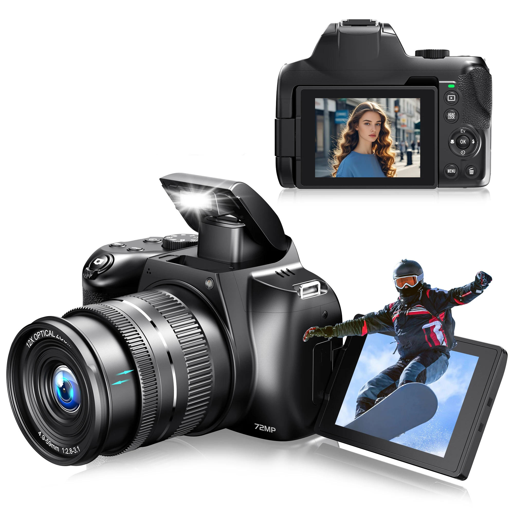 4K HD Digital Camera for Photography 12X Optical Zoom Vlogging Camera 72MP YouTube WiFi Livestream Video Cameras 270°Flip Screen