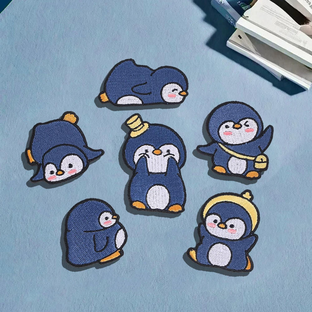 6pcs Cute Penguin Self Adhesive Patches Set Embroidered Fabric Appliques Stick On Badges for Kids Clothes DIY Craft Decoration