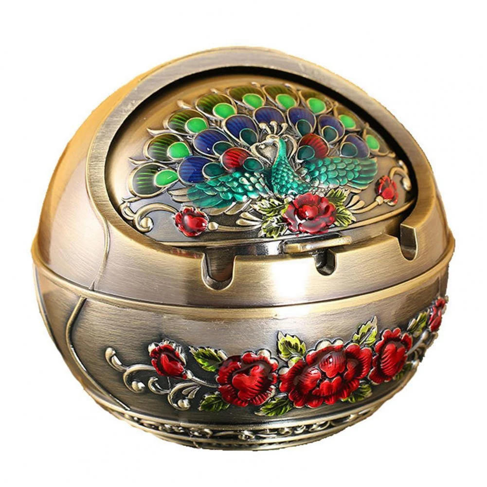 Ashtray Household Home Decor Zinc Alloy Retro Large Ash Holder with Lid for Home ,Peacock