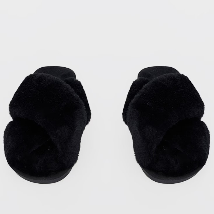 Black Fluffy Cross Strap Slippers