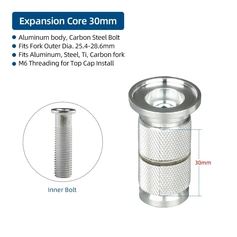 Features - Expansion structure for steerer agency install, no hammers to destroy in; - Constructed by alloy and steel, robust & durable; - No scratches or injury to the internal aspect of the fork tube during installation - Wide scope use for steel, aluminum, titanium or carbon fiber forks - Can be taken out, not only one-time use Specifications: - Material: Alloy & Steel - Expansion Range: 22 ~ 28mm - Application: 25 (1"-1 1/8") External Dia fork tube - Mount: M6 Metric bolts - Install: M5/M6 Hex Key necessary (Not included) - Net weight: Approx 34g - Top Cap N: Aluminum set 15g; Titanium set 7g Package includes: Per order possibility
