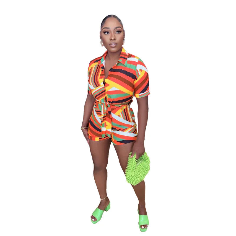 Colorful Stripe Print Two Piece Set Women Short Sleeve Lace Up Crop Shirts Top Elastic High Waist Shorts Summer Casual Suits