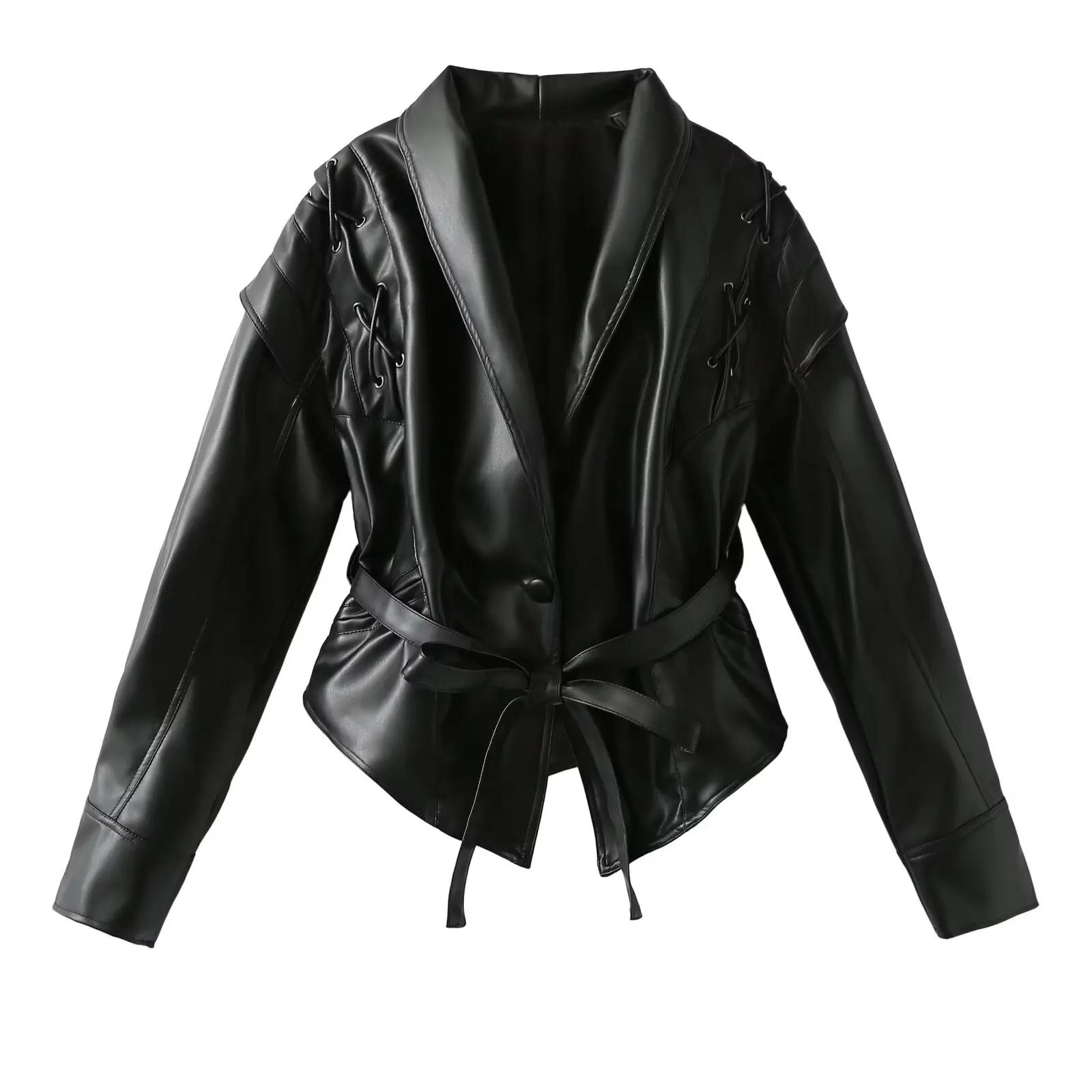 Cool and elegant style American high-end design retro irregular temperament with belt waist leather jacket PU jacket top