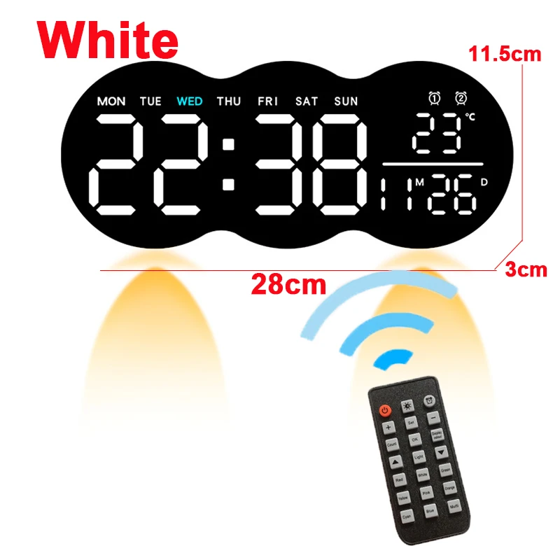 Digital Wall Clock Mood Lighting Temperature Humidity Timing Countdown 2 Alarm Auto Dimmer Plug in Use LED Alarm Clock Remote Features:* Dimming: five stages of guide brightness adjustment, the show can be grew to become off* Same display screen display, date, week, temperature, time and alarm clock are displayed on one screen* Two set up tips There is a hidden stand at the back, which might be placed straight at the desktop or held on the wall* Timing and countdown functions: up to 99 mins and ninety nine seconds* Equipped with remote control, operation is less complicated and more convenient Specification:Name: LED Electronic Wall ClockMaterial: ABSPower supply: USB plug-in useSize: 35*2*15cmFont color: Green/Blue/White/MulticolorShell color: black/White Packing included: 1 * LED Electronic Wall Clock1 * Remote Control Note:1 Due to manual measurements and slight coloration variations, please enable 1-3 cm (0 inches) distinction to suit diversified reveal settings Due to the light and display screen difference, the item&;s coloration may be slightly different from the pictures Please understand  Buyer&;s feedback display Â