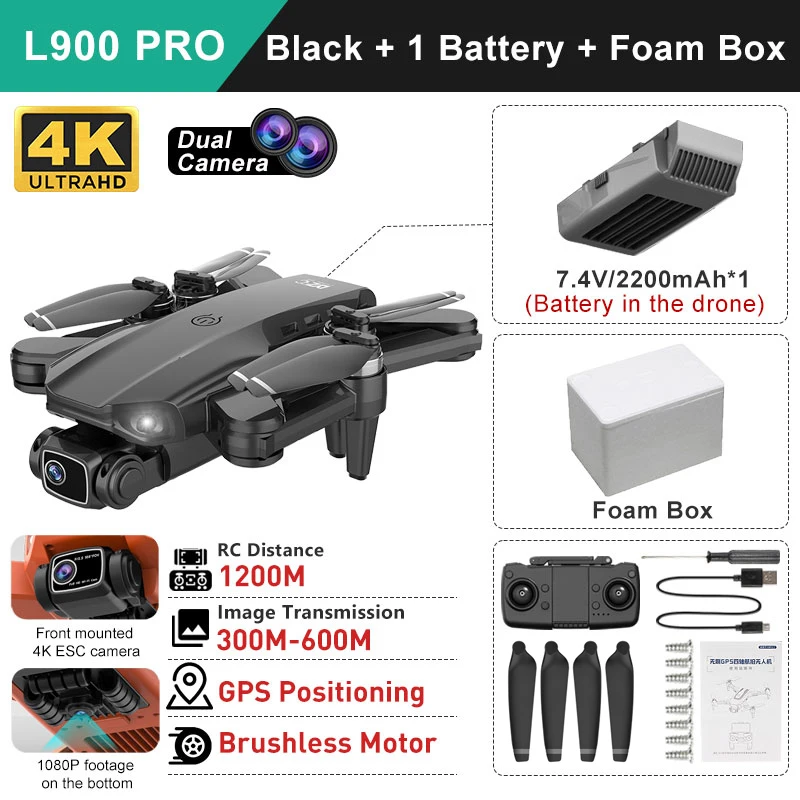 GPS Drone LYZRC L900 PRO 4K Professional HD Dual Camera 5G WIFI Brushless Motor Aerial Photography Drones FPV Foldable Quadcopter L900 PRO Description: Product Model: L900 PRO Channel: 4 Channels Gyro: 6 Axis Motor: 1503 Brushless Motor Electric Adjustment Camera Angle: 90° Camera Wide Angle: 120° Remote Control Frequency: 2 Smartphone Receiving Method: 5G WIFI Channel Remote Control Distance: About 1200 Meters (No Interference, No Occlusion) WIFI Transmission Distance: 300-600 Meters (No Interference, No Occlusion) Drone Battery: 7/2200mAh Lithium Battery Flight Time: About 18 Minutes Charging Time: About 4 Hours Front Camera Photo Resolution: 5120*2880P Front Camera Video Resolution: 1920*1080P Bottom Camera Photo Resolution: 1280*720P Bottom Camera Video Resolution: 1280*720P Frame rate: 25 fps Photo Recording Mode: Remote Control + APP Control Remote Control Battery: 3/350mAh Lithium Battery Quadcopter Size: 32*32*5cm (Unfoldable), 13*10*5cm (Foldable) Quadcopter Weight: 220g L900 PRO Features: 1 With foldable arm, small size, easy to carry 2 ESC 4K HD wide attitude digicam and might adjust the attitude 90° by means of controller 3 With 5G WIFI function can hook up with APP, take photo/video, real-time picture or video transmission four GPS Assisted Flight Provides you with correct positioning details The drone will automatically go back to domestic when its battery is low or the signal is susceptible or when flying out of differ Never demanding about wasting the drone five Optical Flow Positioning Fixed level height, it would shoot more easily and step by step indoor 6 Altitude Hold Mode By environment the air pressure outside, the quadcopter can hover within the air stably, making the capturing simpler 7 Gesture Photo/Video Break the old approach of taking photos, discover the brand new new factor via make gestures to checklist your cosmetic (within the variety of 1-3m) eight 18mins Flight Time The High-capacity 7/2200mAh clever battery yields as much as 18mins flight time 9 Brushless Motor It is so quiet yet very powerful when operating Breakdown rarely happens and motor substitute is seldom required, which makes your flight more satisfying 10 Follow Me Mode drone will mechanically follows and captures you anyplace you move Keeping you in the frame in any respect times, simpler to get complex shots, provides hands-free flying and selfie 11 Waypoint Flight Mode Open the drone APP, use flight plan at your fingertips, simply draw a course at the screen, the copter will auto fly as in step with the given path 12 Fixed Point Surround Choose one point, then the drone will fly round the level in a circle 13 6-axis g-yro which might have extra secure flying and be clean to regulate 14 The quadcopter fuselage is manufactured from high energy and resistant engineering plastics, light-weight 220g and durable resistance L900 PRO Packing List: 1 x L900 PRO (orange/black/gray optional) 1 x Remote Controller 1 x USB Charging Cable eight x Spare Propeller Blades 1 x User Manual