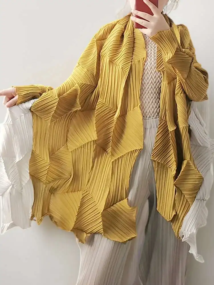 GVUW Pleated Trench Coat Women Fashion Laple Color Block Full Batwing Sleeve Loose Open Stitch New 2025 Outwear Clothing 17G4913