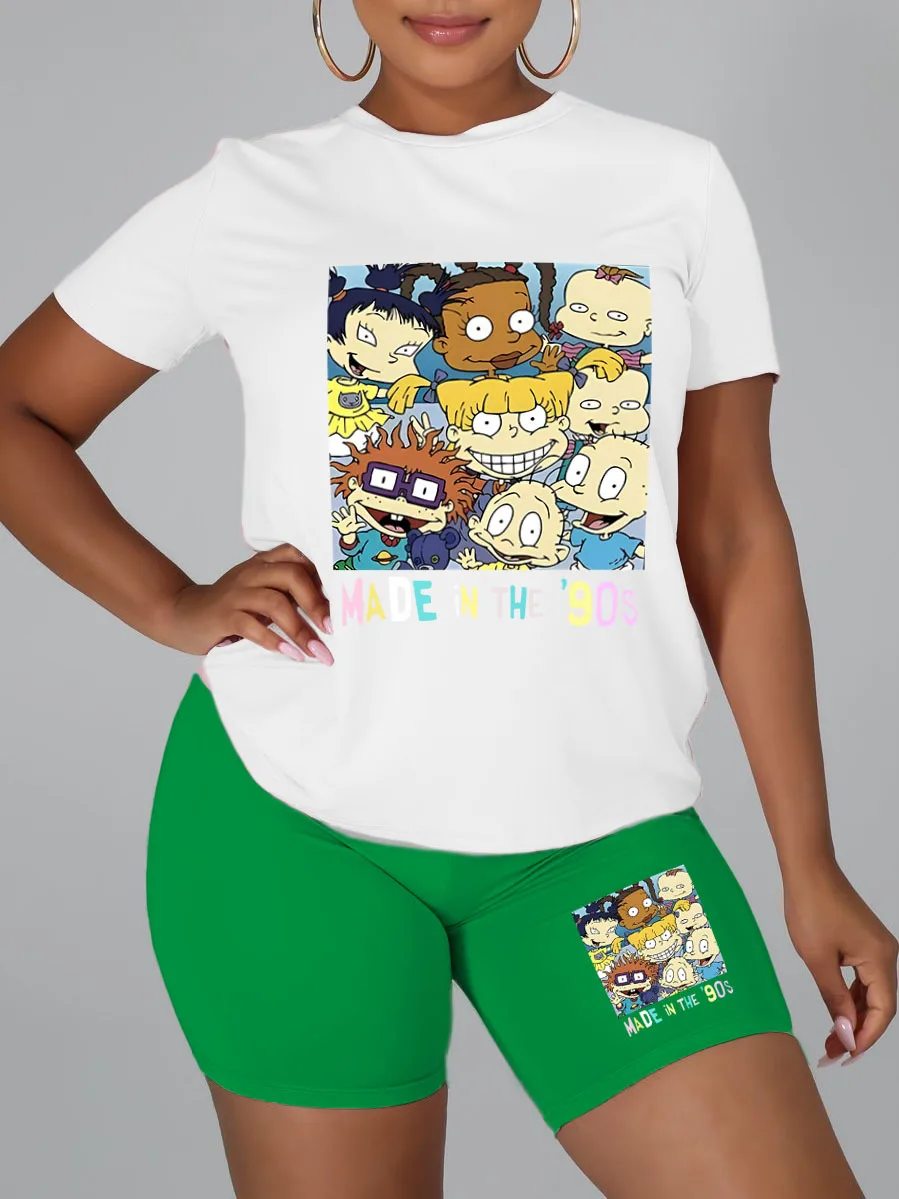 HLJ Fashion Street Style Women Round Neck Short Sleeve Top And Biker Shorts Two Piece Sets Casual Pattern Pirnting 2pcs Outfits