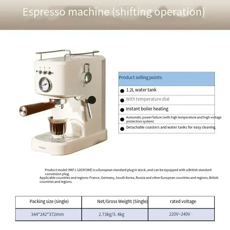 Italian espresso machine semi-automatic extraction Espresso machine family members small handle pill coffee mechanical device coffee maker Model --- KKFJ-1203Y(WE) Plug --- Euro 220-240V spot would be equipped with conversion plug Power --- 1100W Water tank --- 1 water tank Pressure --- 20Bar Characteristic --- With powder bowl, would be geared up with pill handle; Gear transferring operation High pressure extraction Full of mellow fragrance Italian espresso machine Italian espresso machine Easily be aware espresso freedom Italian stress pump / 20Bar excessive strain extraction / Simple operation panel 92°℃ hot temperature / Dense milk bubble elements / Independent dual temperature management system Create an exotic inner most espresso nook Rich Coffee Heals Solitary Time Make fancy espresso freely, awaken fancy new flavor Cappuccino Production time is two mins Production step 1, Add 110ml and foam the milk 2, Extract 40ml espresso 3, Pour a milk spoon into coffee Furuibai Production time is two mins Production step 1, Add 70ml milk and foam it 2, Extract 25ml of subtle espresso 3, Pour the crushed milk into the coffee Mocha espresso Production time is three mins Production step 1, Add 10ml of chocolate sauce 2, Add 40ml espresso and 9ml milk 3, Squeeze in cream and chocolate sauce Retro cream fuselage Integrating existence with artistic creativity A cup of aromatic espresso wakes up the lazy hours within the morning Italy imported pressure pump 20Bar extraction awakens golden oil Stable extraction of each wealthy oil repair the wealthy flavor of espresso Low stress pre-soaking The extraction is extra uniform The low pressure reduces the channel effect, in order that the water flows lightly into each inch of powder cake to totally extract the original taste of espresso despair Pre-soaking [Reduce channel effect] Improve the extraction payment and make the extraction more uniform and satisfactory now not have Pre-soaking [channel effect] Uneven material powder and insufficient extractijon 92°℃ water temperature peneucon Extract multiple flavors of coffee Independent twin temperature control formulas ensures steady water temperature Extract the flavor of normal coffee and launch the unique taste of espresso High temperature and powerful steam Make delicate milk bubbles with dense silk The stable steam entirely blows out the graceful mik bubbles as dense as clouds, making each mouthful of espresso mushy and mellow, and having fun with the soul Simple operation panel Rush out of the master espresso flavor Retro dial for sure displays the temperature update process, and the extraction temperature is apparent at a glance Simple Four Steps 01 Add water to the water tank Fill as much as the waterline Use natural waterKeep the original flavor of espresso 02 Press manage coffee powder Install the manage to start more Press the coffeemachine iconPrompt to put in the handle 03 Add milk to the flower drawing jar Release steam to dispel milk bubbles 04 In the extracted coffee Pour in dense milk foam Tips: Please talk to the handbook for definite operation directions The first cup of coffee to get up in the morning, awakening a stunning day Details determine achievement or failure 1,Hot water function Cleaning the water cup is more handy 2,Top warmth cup subject Equipped with anti drop railing for more secure placement of cyps 3,Detachable water tank Easy to alter water Clean without lifeless ends 4,Detachable water garage tray Easy to wash with out leaving dust Product dossier Pay attention to high quality and detail·extract fragrant and pleasant espresso