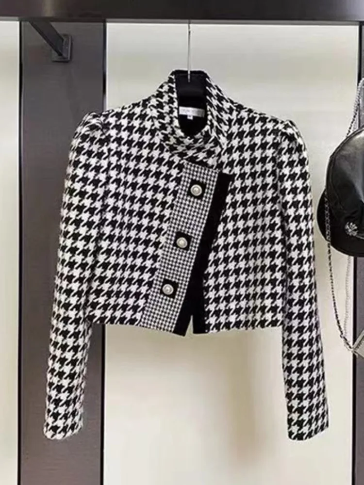 Luxury Brand Houndstooth Vintage Tweed Jacket Coat New Autumn Winter Fashion High Street Small Fragrance Woolen Short Outerwear
