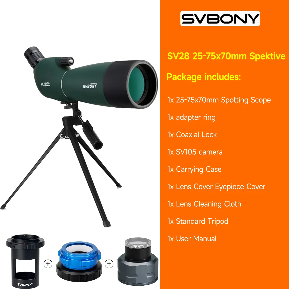 SVBONY SV28/SV28PLUS Spotting Scopes with Tripod,25-75x70,Waterproof,Range Shooting Scope,Compact, for Target Shooting,Archery Features: 25-75x zoom: SV28PLUS recognizing scope is easy to concentration and change magnification, easily establish when staring at birds and surroundings A great spotting scope for newbie to beginner 70mm large object lens: More powerful light accumulating ability, SV28PLUS spotting scope has 70mm tube allows a lot of gentle and respectable view of the target once set, extendable sunshade constructed onto the main barrel to minimize glare IP65 waterproof: Can keep away from unexpected environmental changes to damage the SV28PLUS recognizing scope end is manufactured from a seamless Non-Slip material so it doesn&;t really feel prefer it would slip out of your hands if wet SV28PLUS recognizing scope Includes moveable desktop tripod: the desktop tripod is perfect for differ recognizing Phone adapter makes it simpler to share videos and photos Lightweight and transportable weight: SV28PLUS recognizing scope very compatible for wearing when going out for observation, can also be easily put into the auto for use in relations camping Specification: 1 Name: SVBONY 2 Type: 45-Degree Angled 3: 25x-75x 4 Type: Porro BAK4 five lens diameter: 70mm 6 diameter: 19mm 7 Coating: FMC (A5 wine crimson coating) 8 of view: 64-43 ft/1000yds 9 Relief: 16-14mm 10 cup Type: Twist-up eyecup 11 Focusing Distance: 8m 12: Yes (IP65) thirteen Proof: Yes 14 Weight: 775g (Only Spotting Scope) NEW PHONE ADAPTER 70mm broad purpose lens More powerful mild amassing ability, SV28PLUS recognizing scope has 70mm tube allows plenty of mild and respectable view of the objective as soon as set, extendable sunshade built onto the foremost barrel to lessen glare 25-75x70mm SV28PLUS spotting scope is easy to focus and alter magnification, easily set up when gazing birds and scenery A super spotting scope for newbie to amateur Twist-up Eyecup: SV28PLUS recognizing scope is extra convenient and brief operation, which might eradicate stray light and make the image more pure, fix the cellular telephone adapter to the twist-up eyecup, although the magnification is changed, the location of the cellular phone adapter won't change, which is extra convenient to use;At an identical time, it takes under consideration the needs of people who wear glasses Fully Multi-coated & High Index BAK4 Prism: SV28PLUS spotting scope has the FMC (Red Wine Coatings) aim lens ensures high transmittance for a brighter and clearer aperture, and provides clear, detailed and high contrast pictures and offers easeful observation experience in low-light conditions IP65 Waterproof: SV28PLUS spotting scope is IP65 water-resistant and fog-proof, preventing from the moisture and dirt within the air, therefore, italso adapts to moist environmental conditions, like staring at objectives in a drizzling day Standard UNC 1/4-20 Threaded: The tabletop tripod screw and the SV28PLUS spotting scope screwhole are either UNC 1/4-20 Assemble the recognizing scope and the tripod, and the peak meets the desire of commentary for a inclined position And additionally the spotting scope suits some other typical UNC1/4-20 tripod for a distinct needs of peak Comes with a Tabletop Tripod & a Phone Adapter: The upgraded tripod is roofed with the rubber pads, stabler and firmer And here SV28PLUS spotting scope comes a cellphone adapter, which makes take images or videos more convenient Portable: The SV28PLUS spotting scope is lightweight and compact, easy and conveyable to hold out via being put in the carrying case Various utilization eventualities SV28PLUS recognizing scope chiefly for target, and may even be used for birding watching, watch the scenery, and easy moon watching Customer genuine shots: Parameter comparison FAQ Q1: What is the eyepiece diameter of SVBONY SV28/SV28PLUS? A1: The eyepiece diameter is 15mm Q2: What is the objective lens diameter of SVBONY SV28/SV28PLUS? A2: The objective lens diameter is 70mm Q3: If there are international objects, comparable to hair or threads, contained in the eyepiece of SVBONY SV28/SV28PLUS, can I unscrew the eyepiece in a way and remove the debris? A3: It isn't always commended to disassemble it as grime will enter Q4: Can SVBONY SV28 be used with SVBONY’s astronomical digital camera SC001? 4: SVBONY SV28 ought to be geared up with monocular telescope adapter For D41 and M42*0 to 1" Coaxial Lock Q5: Can SVBONY SV28 be paired with Barlow lens? 5: No Q6:What are the utilization eventualities of SV28/SV28PLUS? A6: SV28 PLUS 25-75x70mm spotting scope is designed for goal looking at for beginners, clean to concentration and change magnification Also the spotting scope is healthier for high-power hen gazing and moon looking at