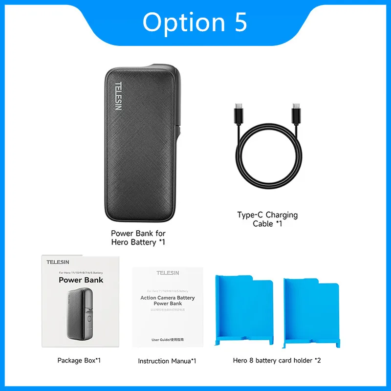 TELESIN Power Bank for GoPro Hero 12 11 10 9 10000mAH with 20W PD Fast Charging Portable Battery Charger For Gopro Action Camera Feature: 1 Bank For Gopro Hero 12/11/10/9/8/7/6/5 Battery Charging battery 、Charge cellphone 、Charge instruments 2 Design For Hero batteries Innovative strength bank for "Storage + Charging' Auto power off when complete charged, eficient and safe With a free battery tray Compatible with Hero 8/7/6/5 batteries 3 Samsung high-capacity density battery cells Adopt tremendous 10000mh battery cellular adjust to national portableLi-ion battery Safety normal GB31241-201 it should charge iphone 14 as much as two times four ports output at the identical time to 3 simultaneous charging at the Hero battery USB-C and USB-A ports five is even a low latest mode with computerized reputation when plugged in, compatible for cellphones / bluetooth headsets / outdoors lighting fixtures outdoors audio system and many others and play 6 20W Fast charging Less ready 7 Safe protections for Charging Protection for each use,solving the priority of security hazards eight you when taking pictures exterior compliant, it may be excited by you on planes and trains, outdoors camping, travelling and taking pictures with out anxiousness Specification: Product Name:Power Bank for Gopro Hero 12/11/10/9/8/7/6/5 Battery Product Weight:253 +10g Battery slot output:4/≤900mA Power Bank Capacity:10000mAh Product dimensions:128*62* 37 USB-C input/output:5V/3A, 9V/2, 12V/1 Operating Temperature:Charging: 0°C~45°C,Discharging: -10°C~60°C USB-A output:5V/3A , 9V/2, 12V/1 Cautions: 1 Do not put the battery into the fire, heat it or put it close to the heater or fire supply 2 Do not disassemble the battery on your own 3 Do not strongly hit, throw, trample or pierce the battery four When abnormalities happen (severe deformation, odour, heat, discolouration), make sure you quit utilizing the battery 5 Do no longer store the battery in the attain of kids Package List: Option 1: Power Bank for Hero Battery*1 Package box*1 USB-C to C data cable*1 Instruction manual*1 Battery card holder*2 Battery (yellow)For GoPro Hero 12 11 10 9 *2 Option 2: Power Bank for Hero Battery*1 Package box*1 USB-C to C records cable*1 Instruction manual*1 Battery card holder*2 Battery (blue)For GoPro Hero 12 eleven 10 nine *2 Option 3: Power Bank for Hero Battery*1 Package box*1 USB-C to C information cable*1 Instruction manual*1 Battery card holder*2 Battery (Supports rapid charging)For GoPro Hero 12 11 10 9 *2 Option 4: Power Bank for Hero Battery*1 Package box*1 USB-C to C records cable*1 Instruction manual*1 Battery card holder*2 Battery (Supports instant charging and can be used at low temperatures)For GoPro Hero 12 11 10 nine *2 Option 5 Power Bank for Hero Battery*1 Package box*1 USB-C to C data cable*1 Instruction manual*1 Battery card holder*2 TELESIN Endurence Battery