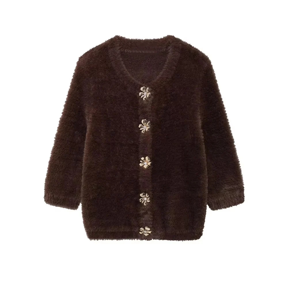TRZA-Women's Gem Buttons Knit Cardigan Sweater, O Neck, Three Quarter Sleeve, Female Outerwear, Chic Tops, Fashion