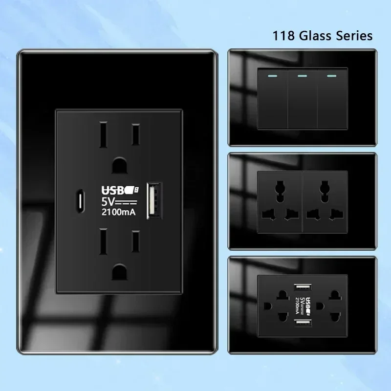 American Type-c Quick Charge Wall Power Outlet,2Way Light Electrical Switch Panel,Mexico Thai US Tempered Glass usb Socket Plug
