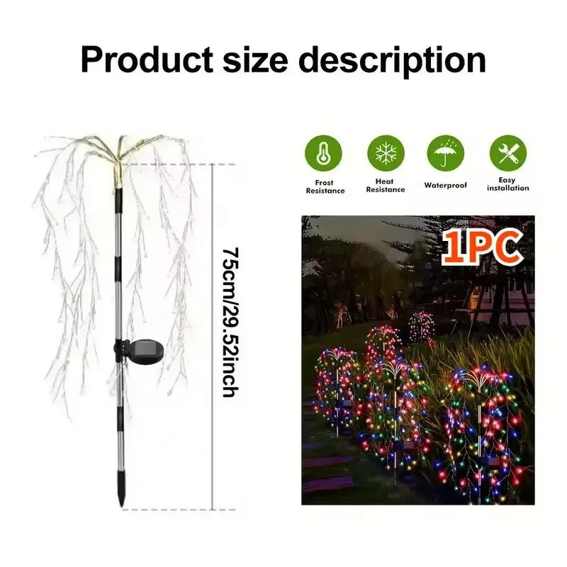 Description Type: Solar Powered Willow Tree Fireworks Lamp Light source: 200/120LED Colour: Multi-colour/warm white Material: copper Waterproof rating: IP65 Charging time: 6-8 hours Lighting time: 8-10 hours Lighting modes: 8 modes Working mode Light control sensor, main exchange Features: 1, Waterproof: The solar panel has a special IP65 water resistant design, which can withstand every kind of bad weather. 2 strength supply: The Solar Light is durable, environmentally friendly, and reliable. It does not require any energy cord. Instructions for use: 1. The product itself can have no power, you need to turn on the switch and place it within the solar to price for greater than eight hours 2. The product has a photosensitive function. When it's night, the product will automatically gentle up, and it'll mechanically turn off when it is dawn. Description: The product can be utilized in wedding layout, get together decoration, marriage ceremony room decoration, Christmas supplies, trip supplies, outside decoration, garden light, store decor, yard decor.