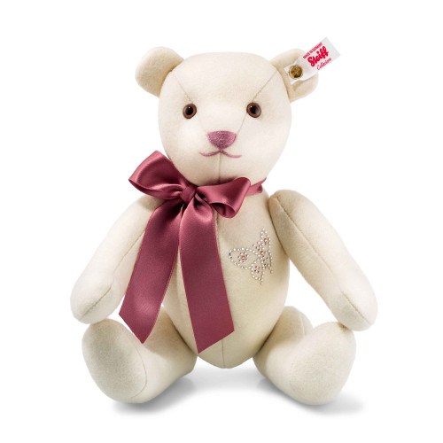 Both lovers of modernism and traditionalists will appreciate our main Club edition for the year. Sewn from genuine wool felt made by one of our oldest suppliers, this magnificent creation stands almost 12" tall and is five-way jointed. She has brown pupil eyes and hand-stitched facial features in the color of antique roses. A matching deep pink ribbon adds to her traditional, feminine appeal. But what really sets her apart is the delicate Springtime butterfly outlined in magnificent Swarovski® crystals -- a modern touch that will simply take your breath away! Production is strictly limited to the 2018 calendar year only, so there's no time to waste in making her yours. Product Details: Material: Made of finest wool felt stuffed with synthetic filling material Size: 12 inches Color: Cream Eyes: With safety eyes Joints: 5-way jointed Ear Tag: With gold-plated Button in Ear Pose: Standing Care: Surface washable Country of Origin: Germany