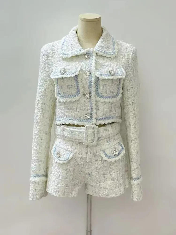 2023 Autumn Winter New Y2K Style Heart Shaped Button Tweed Short Coat Jacket + High Waist Shorts Suit Women Two Piece Sets