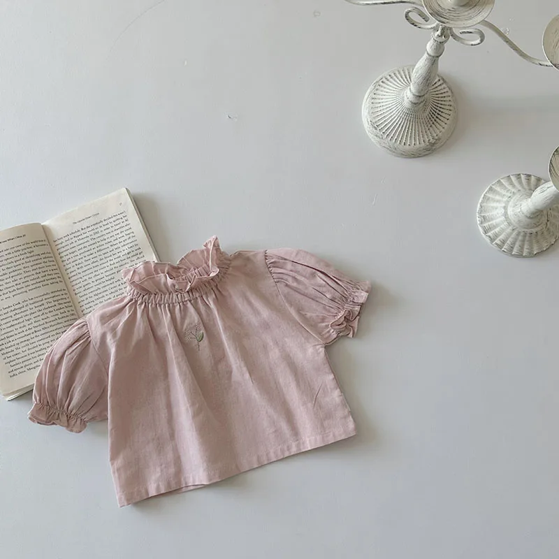 2024 Summer Baby Blouse Lovely Girls Embroidered Flowers Pullover Sweet Infant Ruffled Collar Shirt Toddler Clothing