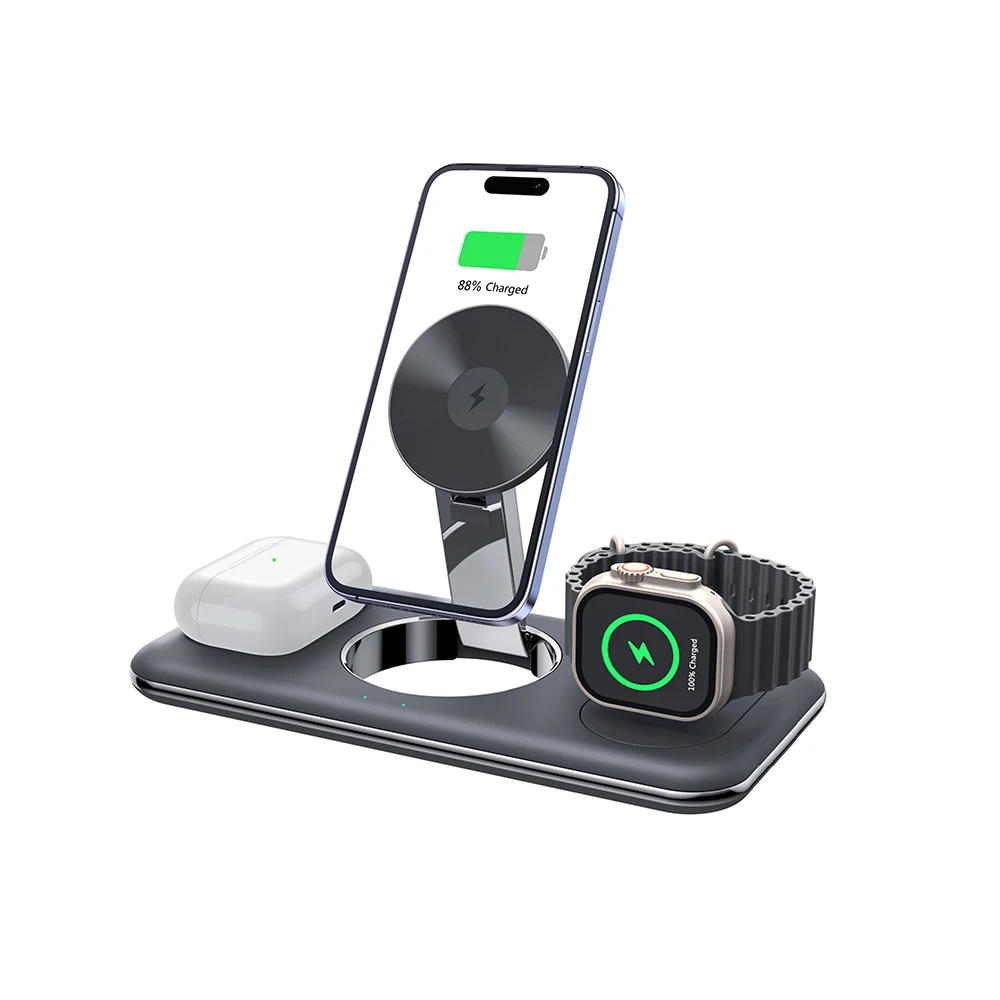 3-in-1 Alloy Zinc Foldable Magnetic Wireless Charger Stand Pad for iPhone 15 14 iWatch AirPods Macsafe Charging Docking Station This 3 in 1 magsafe charger was made of Zinc Alloy, heat dissipation easily, much more fast charging efficiency, keeping the charger in a cool charging environment all the time. {Main Features} 1). 3 in 1 design Can charge iPhone, AirPods, Apple Watch at the same time. 2). 200g base zinc alloy die-casting, weighted design. This magnetic wireless charger stand will keep stable while take off your phone, the solid design is convenient and useful. 3). Compact and foldable design, adjust the holder at different angle. 4). Finishing: Rubber oil, Electroplated. 5). Apple watch charger holder also can be foldable, you can lie down charging or vertical charging. {Specifications} Input: 5V/2.5A, 9V/2A Material: ABS + PC + Zinc Alloy, CD design Finish: Rubber oil, Electroplated. Output: 5/7.5/10/15W for Phones, 5W for Airpods, 3W for Watch Product Size: 191×94×16mm Package Size: 148x30.5x197.5mm Net Weight: 345g Gross Weight: 440g Color: Black/White Certificates: CE FCC RoHS {Note} 1). This 3 in 1 wireless charging stand only can charge Apple Watch. 2). For fast charging experience, please use QC 3.0 Power adapter or others above 18W. 15W 3-IN-1 Foldable Magnetic Wireless Fast Charging Station Charge all your Apple device at the same time: iPhone, AirPods, Apple Watch. Foldable Design Strong Magnetic Fast Charging 200G Weighted Base Safety Protection New Foldable Design, Easy to Store Lightweight features make it easy to put in your pocket or bag for home, office and travel. Foldable iPhone Charging Stand Foldable iWatch Charging Stand 200G Steel Weighted Design Pick or place your devices, no need to worry about slipping. Portable Foldable Design Multiple type of charging, more choice Two charging way: Vertical charging mode Lie flat charging mode Universal Compatibility Horizontally or vertically charging, for video call, chating, movie, games, etc. Charging with Safety More peace of mind when charging at night Multiple protection Over-current protection Over-voltage protection Temperature protection Short-circuit protection Package List 1).1 x 3-in-1 Foldable Magsafe Wireless Charging Docking Station 2).1 x USB Cable 3).1 x Manual 4).1 x Color Box Color Display Black or White, up to you. wireless chargerwireless charger, magsafe charger, I phone wireless charger, Wireless charger for iphone, Macsafe Portable charger for cell phone, Charging station, car phone holder, fast wireless charger for iPhone, charger for apple watch, magsafe wireless stand, Fast charging wireless charger, induction charger for iPhone, phone accessories for iPhone, wireless charger for samsung, Induction charger, Car cell phone holder, phone accessories, Mag safe car charger, phone holder, 3 in 1 wireless charger for apple, portable charger for cell phones, charger fast charging, magsafe car holder, magnetic car phone holder, 3in1 charger, cell phone holder, charger station, wireless charger for car, magnetic charger for iphone, car wireless charger, mag safe charger stand, cell phone wireless charger, 3 in 1 charging station for apple, Magnetic wireless phone holder, Wireless charging pad, Mobile phone wireless charger, mobile phone holder car, portable wireless charger for Iphone, Wireless charging, wireless charging station, wireless chargers, Magnetic wireless charger, 3 in 1 wireless charger, 3 in 1 charger for apple, Wireless charger 3 in 1, wireless docking station for apple, mag safe car mount, Wireless charger for car holder, qi wireless charger, car charger, mag safe holder in the car, Mobile phone holder for car, wireless car charger, mag safe stand charger, magnetic wireless charger, 3 in 1 wireless charger, wireless Car induction charger, wireless charger stand, 3 in 1 wireless charging stand