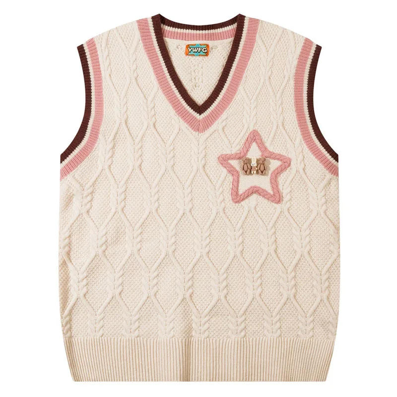 Autumn Sleeveless Sweater Vest Males Harajuku Star Embroidered Informal Pullover Ladies Japanese SchoolModel Oversize Jumper Spring