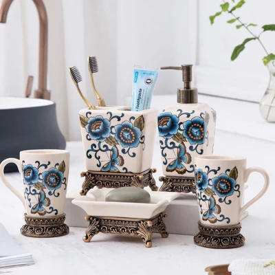 Bathroom Accessories Set Ceramic Soap Dispenser Toothbrush Holder Gargle Cup Soap Dish Bathroom 5 Pieces Products Carved Base