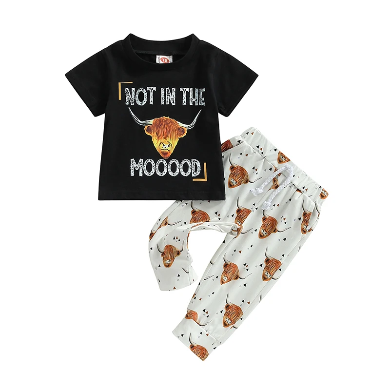 Boys Girls Pants Suit Casual Street Party Short Sleeve Kids Tops Bull Print Long Pants