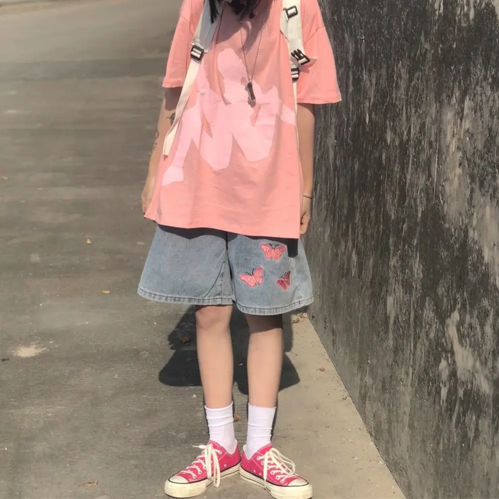 Butterfly Embroidery Jeans Shorts Y2k Streetwear Wide Leg Pants Women Korean Fashion Vintage Kawaii Casual Loose Trousers