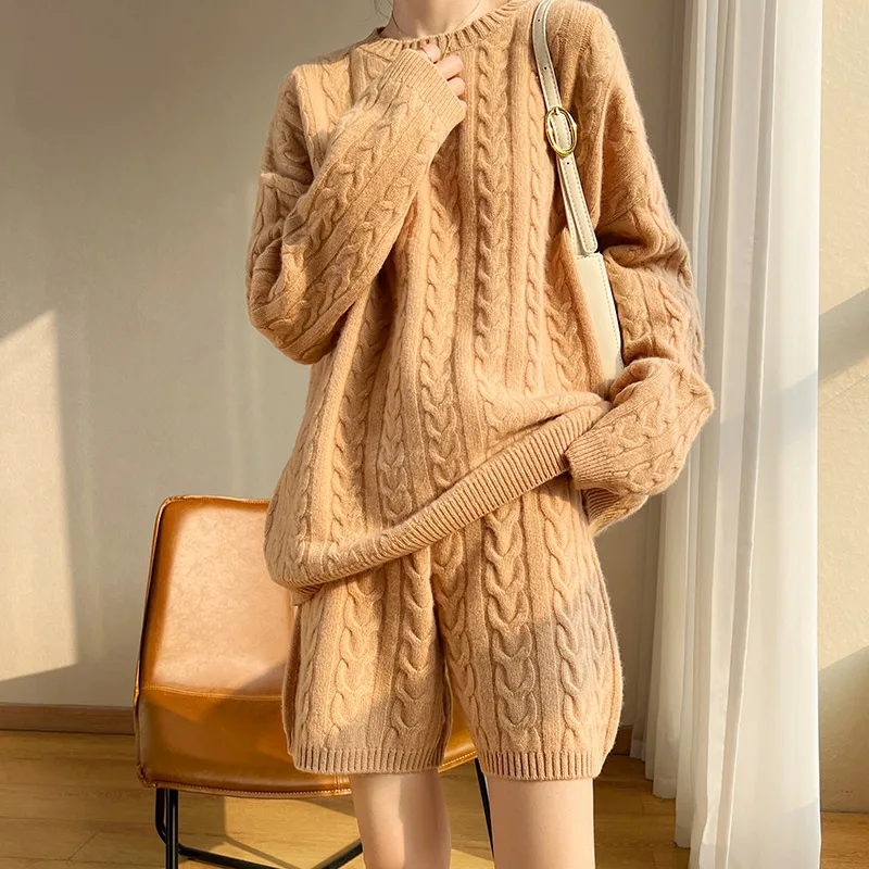 Fashion Suit Spring Autumn 100% Wool Knitted High Quality Thicken Sweater Women Sweater Tops And Short Pants Two-Piece Female