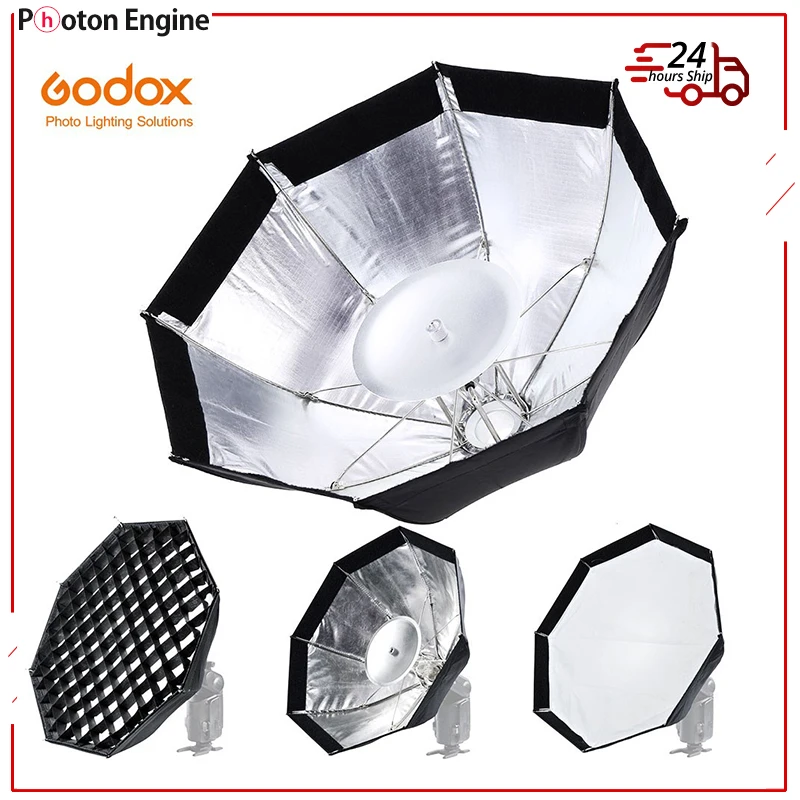Godox AD-S7 Multifunctional Soft Box Octagonal Honeycomb Grid Umbrella Softbox for WITSTRO Flash Speedlite AD180/AD360 Description:This 47cm/18" Godox Folding Octagonal Softbox produces mushy and even illumination, widely used by professional or newbie pictures on portraits, pets, jewelry or different products When use it taking pictures portrait, gets appealing lighting in the eyes Comes 3 accessories- Silver Disc, Diffusion Cover, Honeycomb hide for various environment to create varied effectSilver Disc: Reduce unnecessary shadow and concentrating light, boost the stereovision and stereoscopicHoneycomb Cover: Cover this octagonal softbox with the Velcro to control light spill and make the sunshine more softe and even, add persona eyes lightWhite Diffusion Cover: make gentle uniform diffusion, gentle and natureUnfolds like an umbrella for quick installation and easy portabilityMade of fine high quality material, durable for long run useUsed along with flash, specially for WITSTRO flash AD180/AD360 Specification:Size: 47cm/18"Total weight: 560g Package included:1 x Godox AD-S7 Multi-functional Softbox1 x Silver Aluminum Disc with 3/8" Thread1 x Diffusion Cover for Softbox1 x Honeycomb Cover with Velcro1 x Carry Pouch
