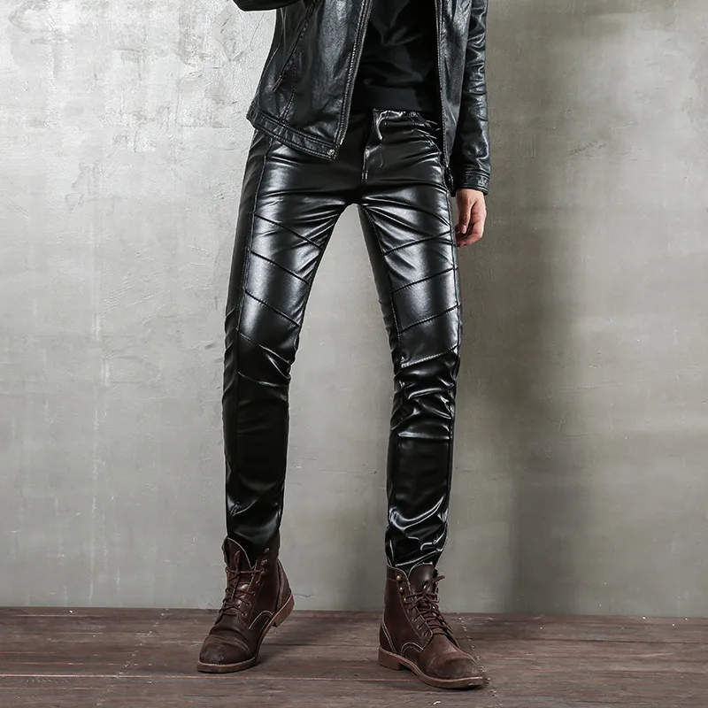 Pantalones de cuero Punk para hombre, pantalones ajustados de cuero PU para motocicleta, empalme juvenil
